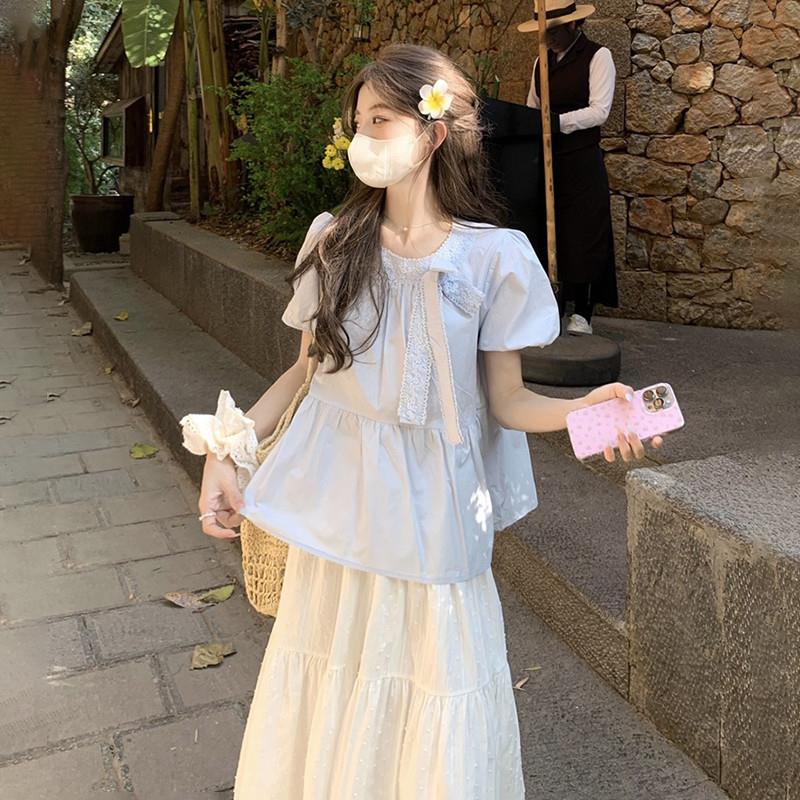 藍色泡泡袖短款上衣女夏2025新款多巴胺穿搭法式娃娃衫短袖小個子