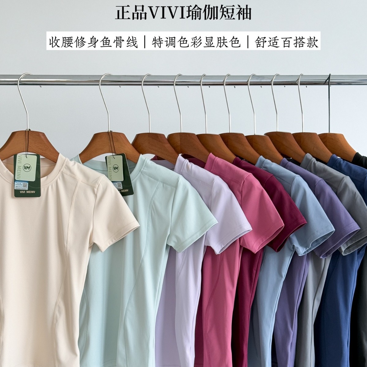VIVI正肩瑜伽短袖女夏季新款顯瘦收腰修身魚骨線設計運動瑜伽服