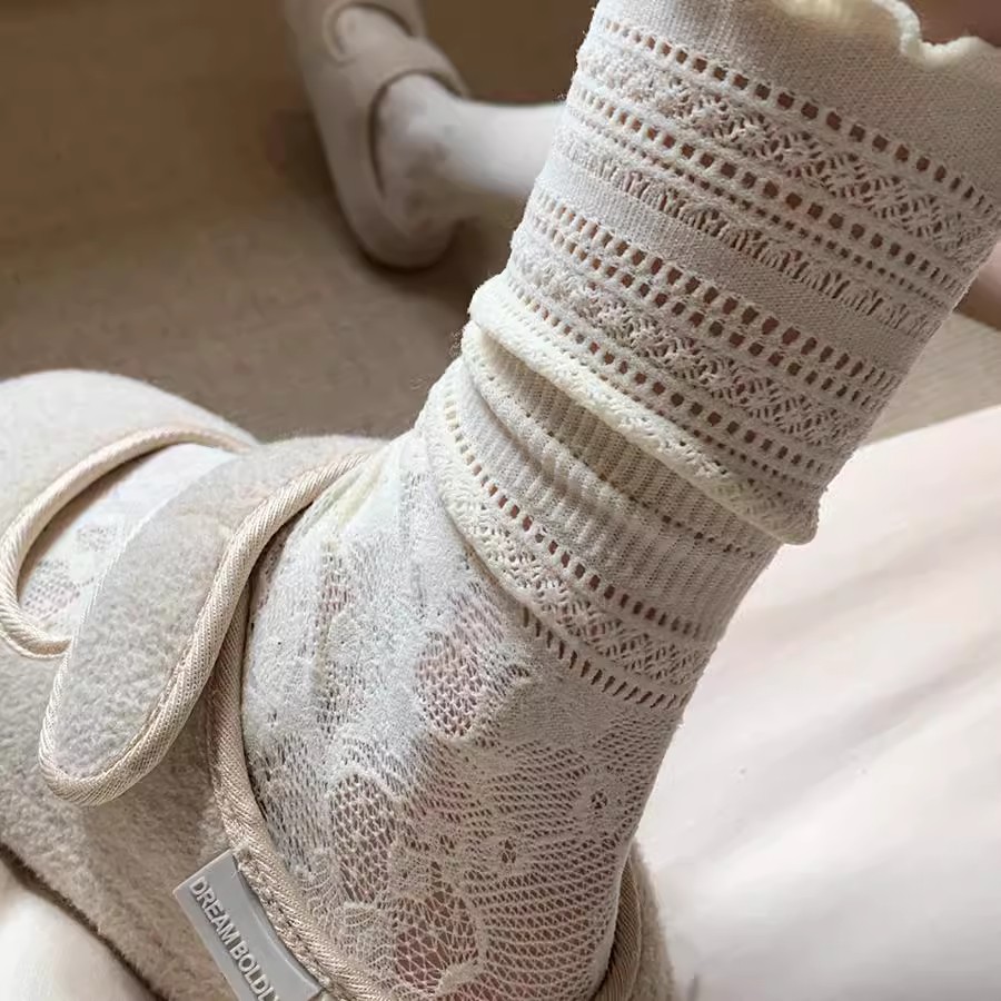 奶油色系襪子女新款芭蕾風鏤空網眼中筒襪春夏薄款透氣配小皮鞋