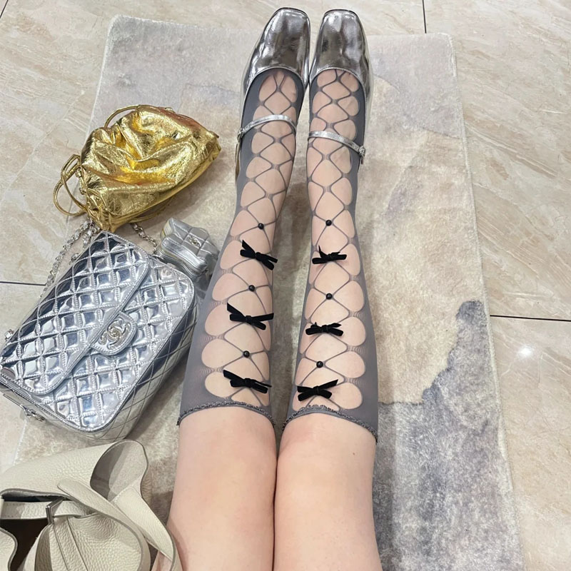 灰色小腿襪蝴蝶結珍珠中筒襪鏤空綁帶辣妹鏤空千禧y2k漁網襪夏季
