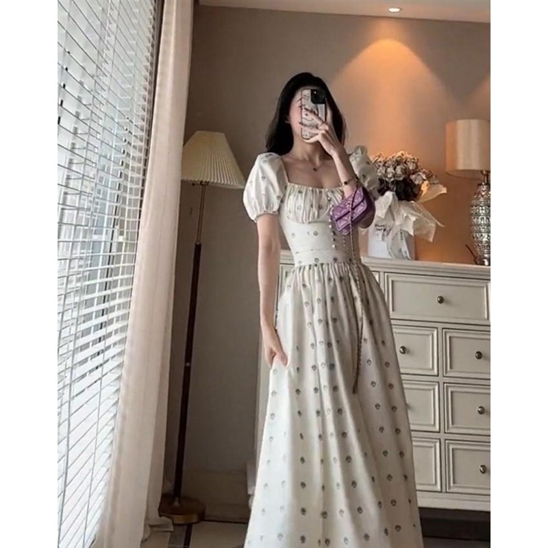 024年法式茶歇方領泡q泡袖碎花連衣裙設計感小眾收腰大擺長裙女夏