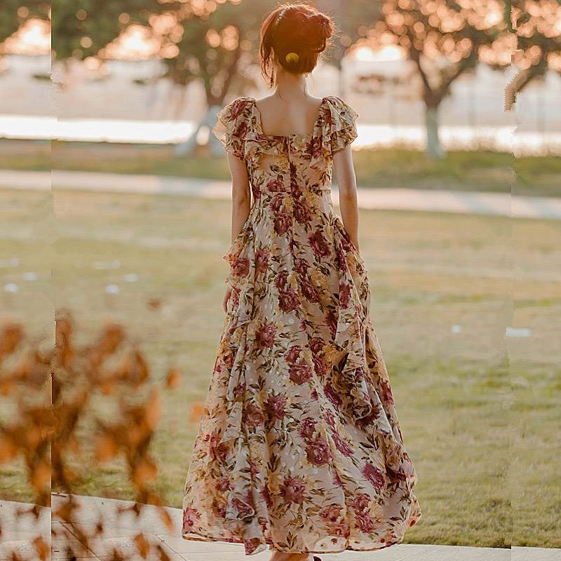 茶歇法式初戀甜美仙氣超仙森系甜A辣長裙及腳踝碎花印連衣裙女夏
