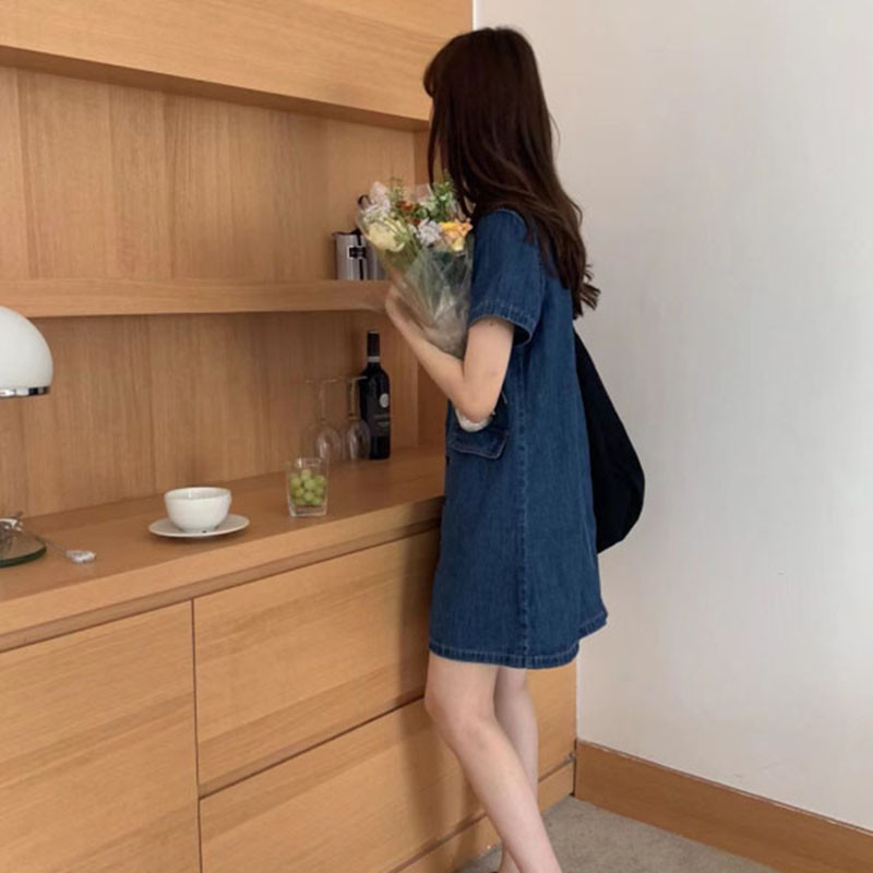 小個子深藍色牛仔短裙2025夏季新款小眾設計感寬松直筒法式連衣裙