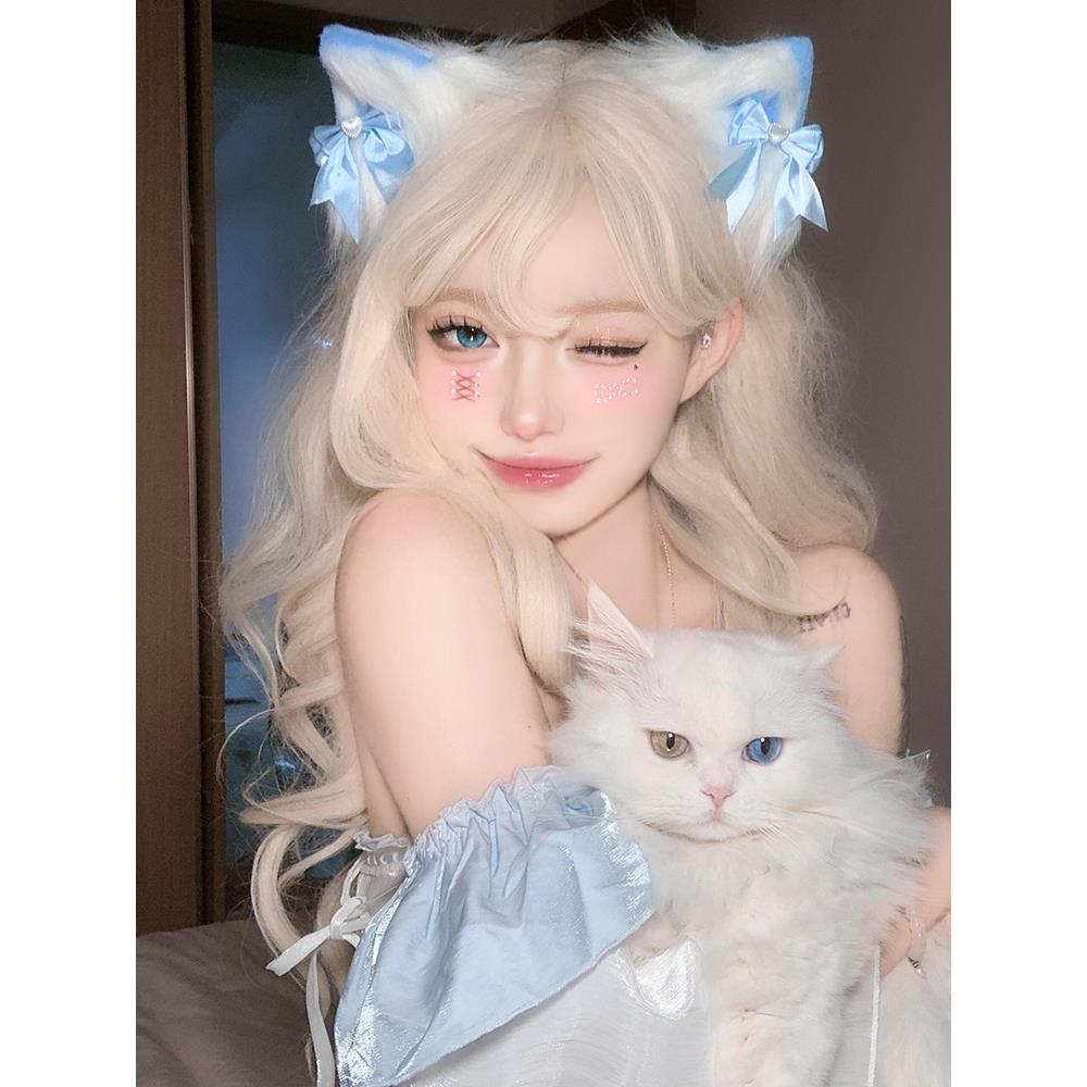 可愛藍色蝴蝶結貓耳朵發夾女毛絨獸耳lolita發卡夾子cos女仆發飾
