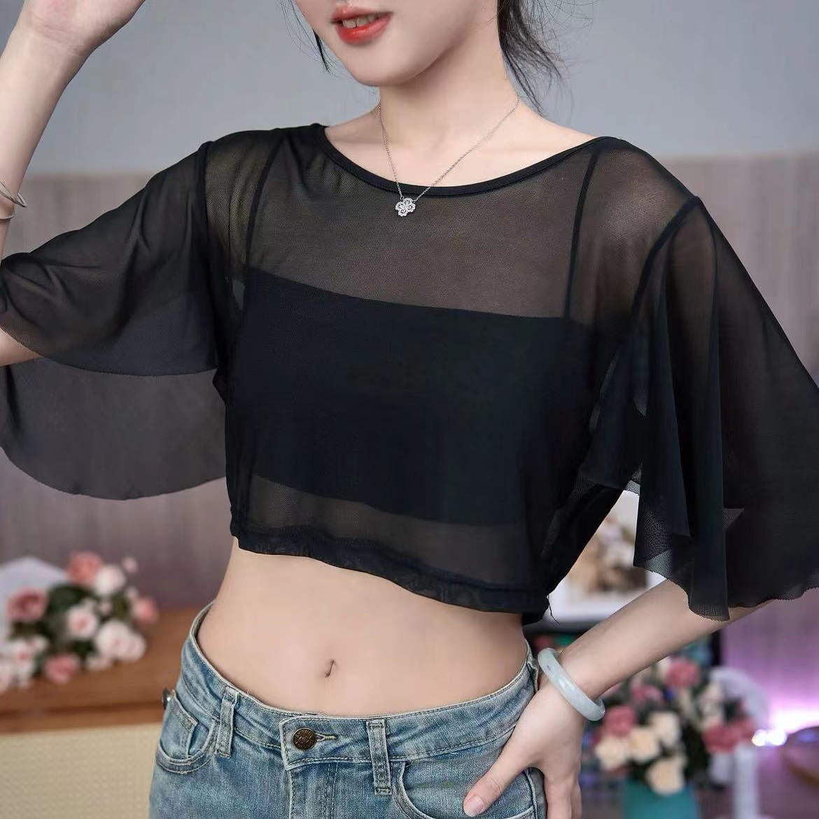 【疊穿內搭神器】網紗超薄透氣飛飛袖女士上衣T恤短款顯瘦小披肩