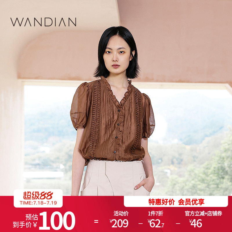 婉甸棕褐色短袖上衣夏季新品V領寬松小衫1232H03RS2