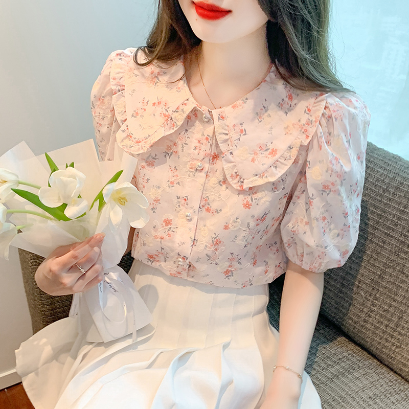 風笛2025夏季新款甜美花邊娃娃領短袖襯衣復古泡泡袖減齡雪紡衫薄