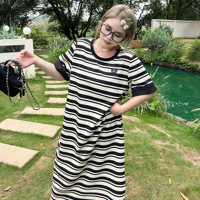 媛子家大碼夏季新款時尚遮肚顯瘦長裙條紋胖mm寬松通勤休閑連衣裙