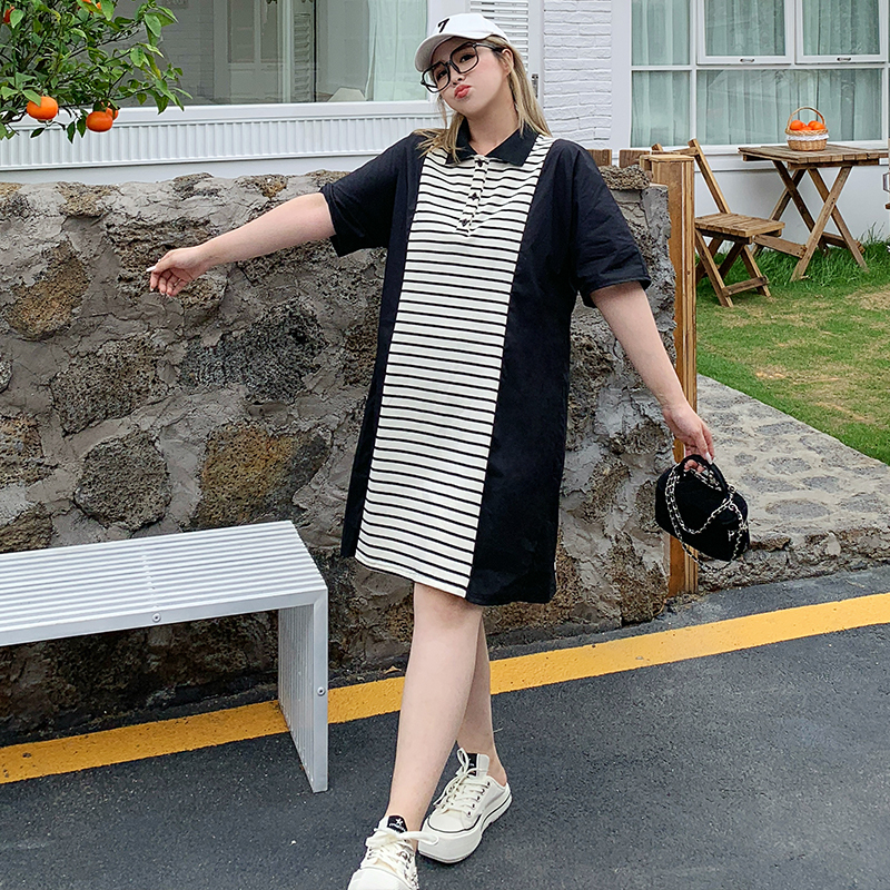 正肩氣質連衣裙大碼女裝裙子女夏裝胖女孩胖mm寬松春裝polo領裙子