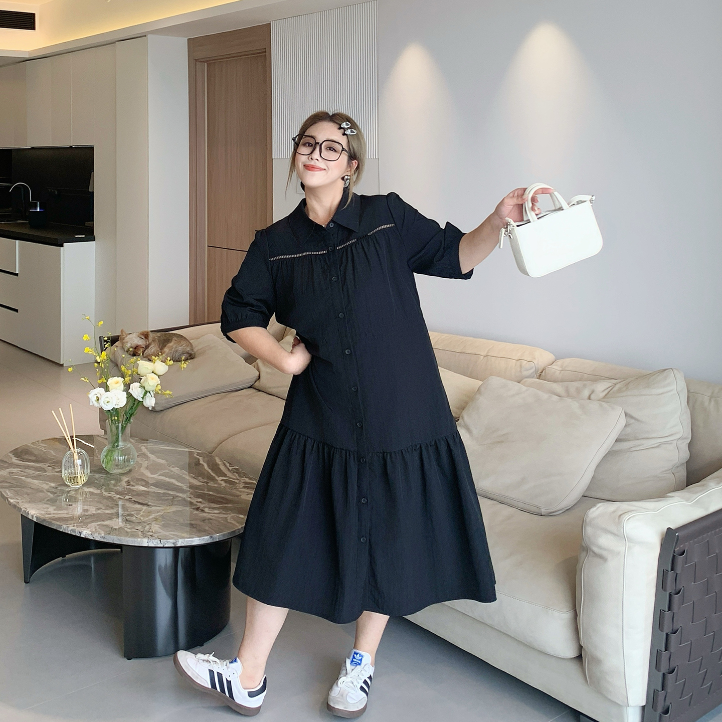 媛子家大碼夏季遮肚寬松設計感連衣裙純色胖mm長裙翻領休閑甜美女