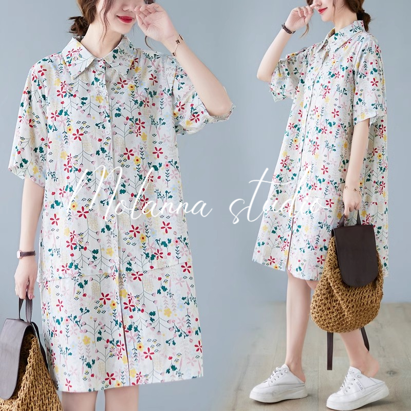 Molanna棉麻短袖襯衫裙女夏季新款寬松大碼中長款碎花連衣裙子薄