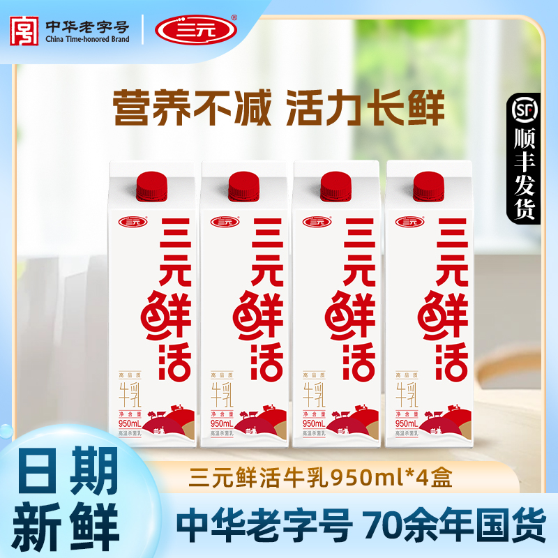 三元鮮活低溫牛奶950ml*4瓶生牛乳營養早餐純牛奶學生孕婦牛奶