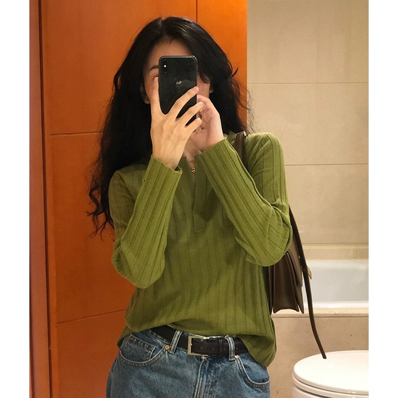 綠色V領針織衫女春秋新款寬松顯瘦坑條設計感內搭長袖打底衫上衣