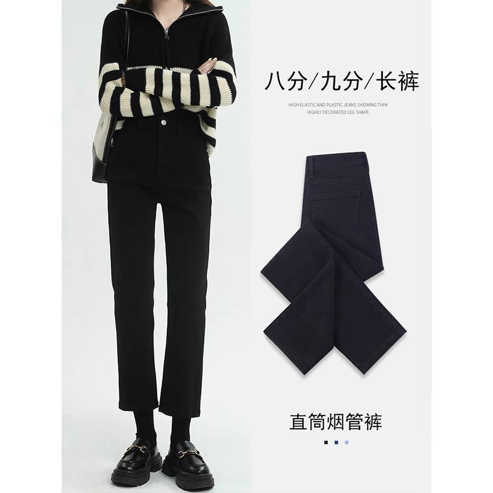 黑色直筒牛仔褲女秋冬加絨高腰四面彈顯瘦百搭小個子九分褲煙管褲