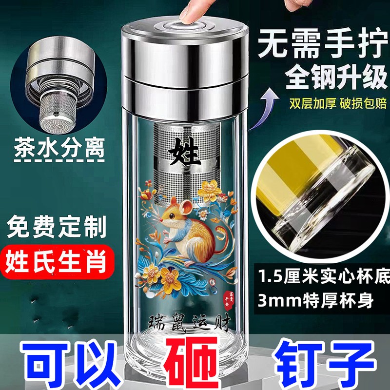 升級全鋼速開蓋生肖雙層防燙茶杯大容量防爆茶水分離保溫防摔水杯