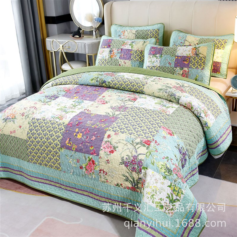 新款三件套衍縫被花卉拼接款床上用品四M季通用純棉床蓋三件套
