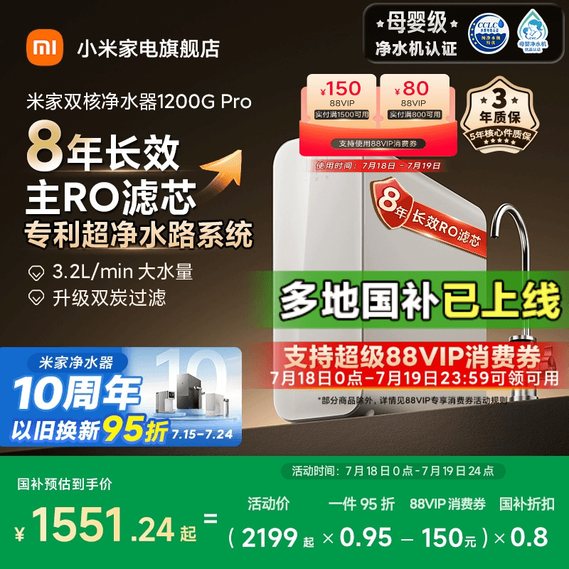 【政府補貼20%】小米米家凈水機器雙核1200GPro過濾家用凈飲機