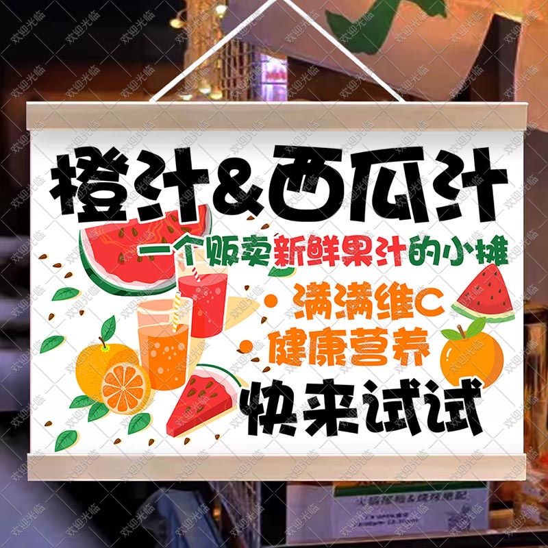 冰鎮鮮榨橙汁西瓜汁掛畫擺攤廣告招牌防水移動攤位夏日果汁廣告布