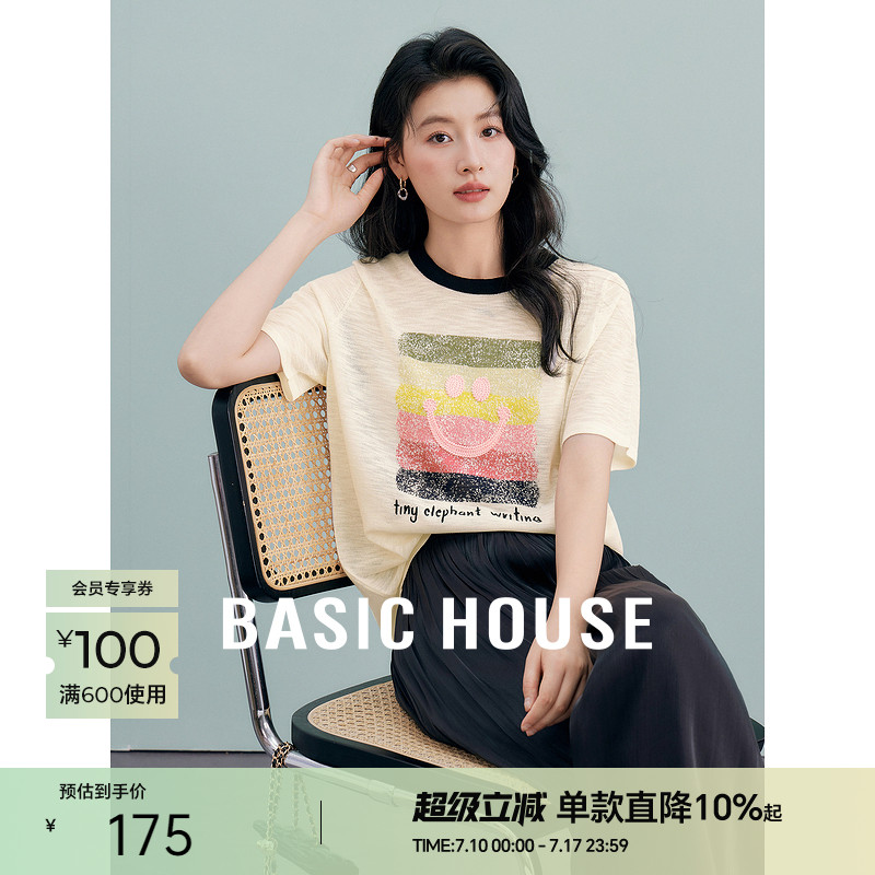 Basic House/百家好笑臉刺繡針織短袖減齡寬松T恤上衣女2025夏季
