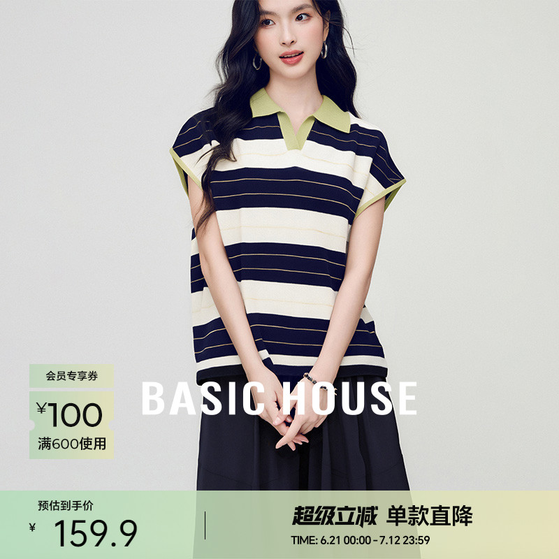 Basic House/百家好撞色條紋polo領針織衫夏季好看小飛袖短款上衣