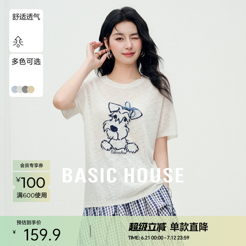Basic House/百家好小狗提花針織短袖女夏季趣味減齡圓領顯瘦上衣