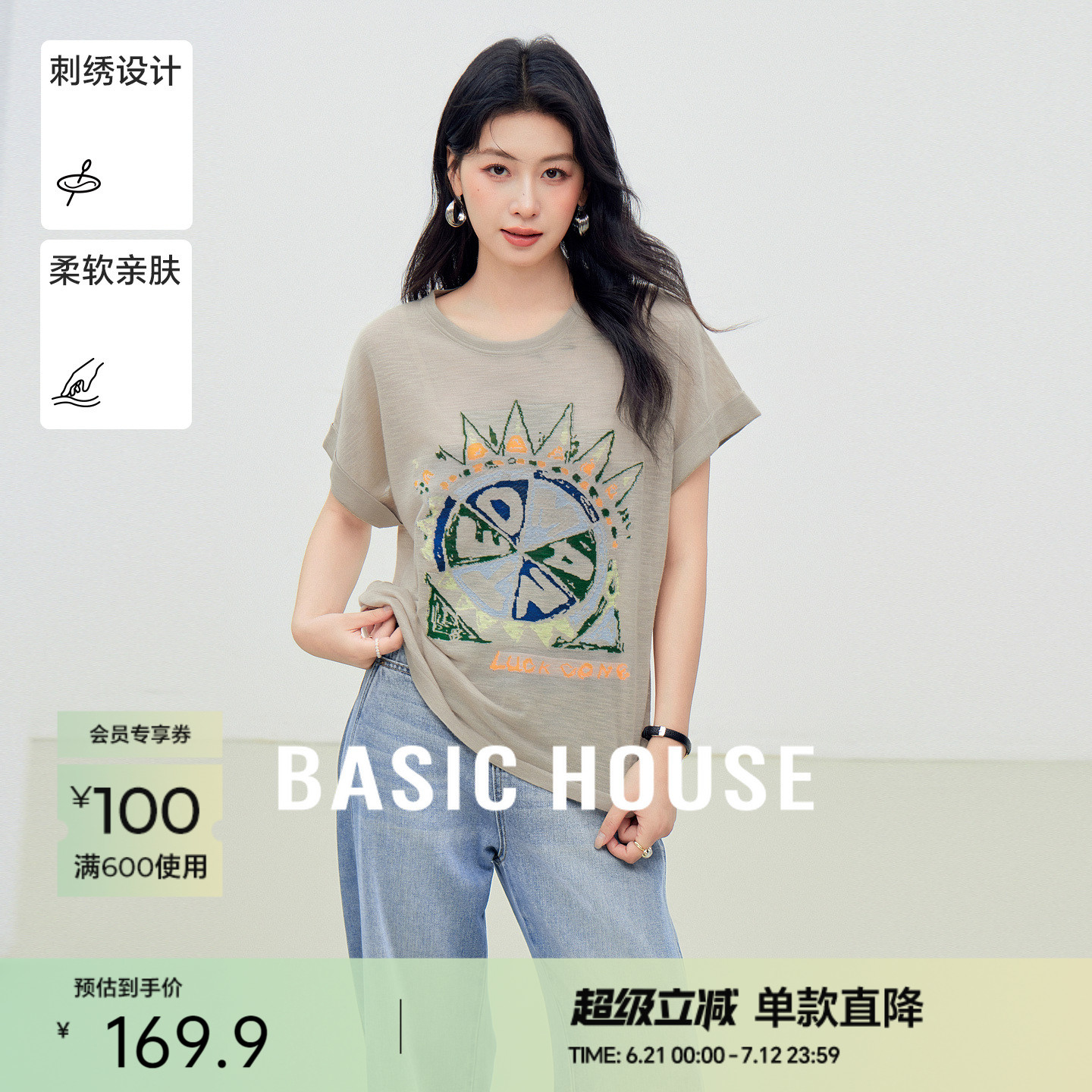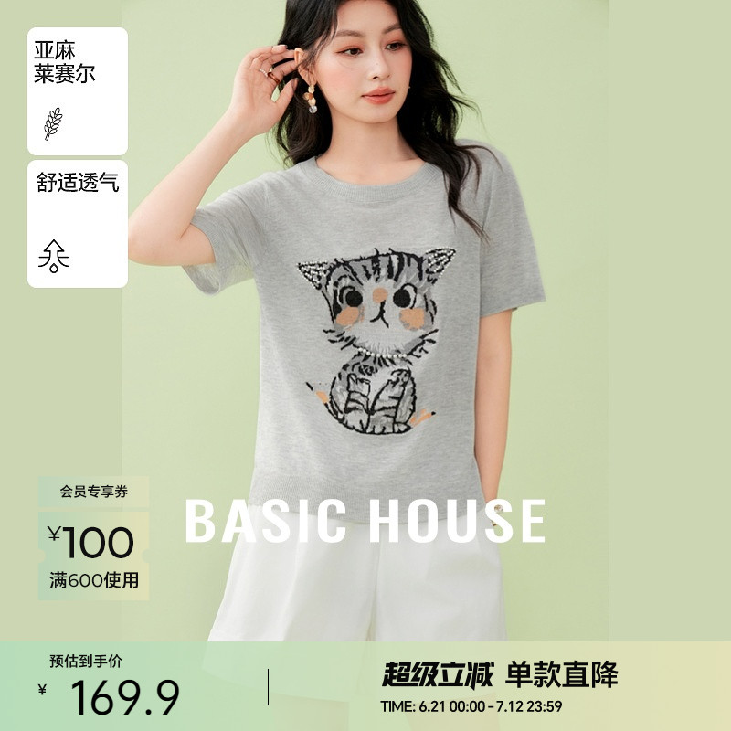 Basic House/百家好卡通刺繡圓領短袖針織衫夏季新款短款套頭上衣