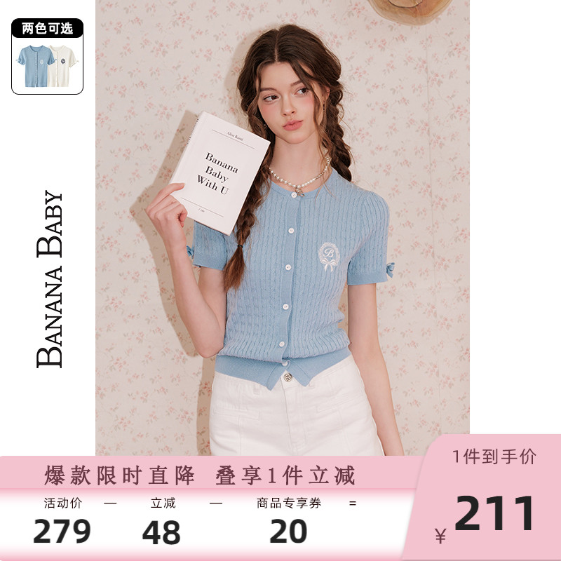 BANANA BABY2025年夏季新款學院風原創提花針織女蝴蝶結短袖上衣