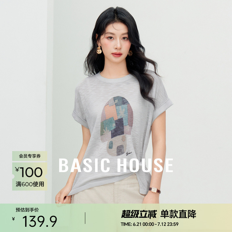 Basic House/百家好櫻桃印花薄款針織衫夏季流行圓領短袖套頭上衣