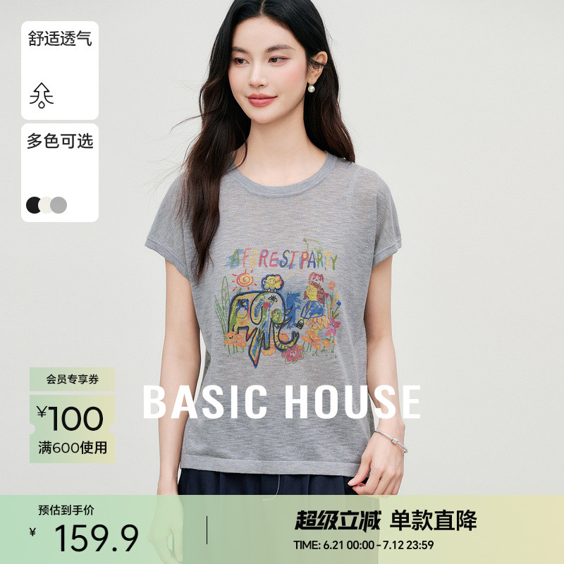 Basic House/百家好撞色圖案印花短袖針織衫夏季新款圓領套頭上衣