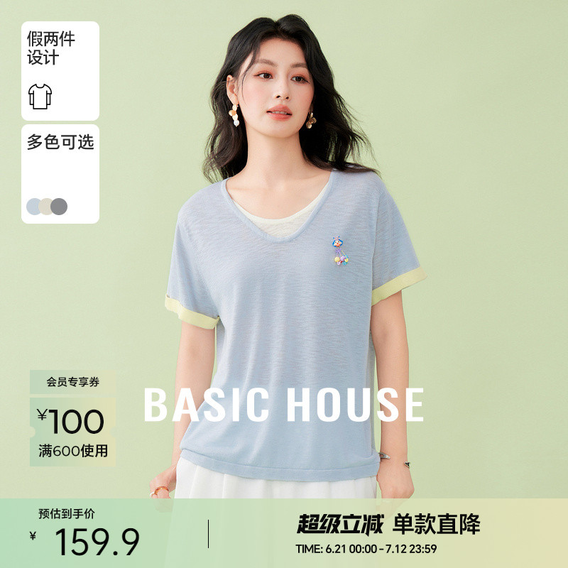 Basic House/百家好可露麗撞色假兩件短袖針織衫夏季新款短款上衣