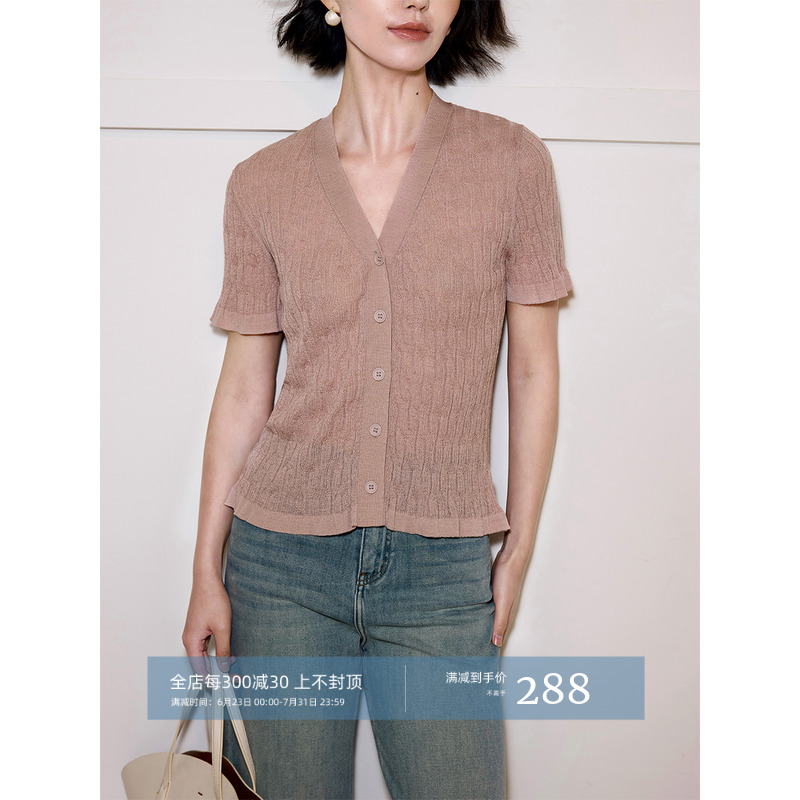 BANANA CICI2025年夏季新款復古絞花萊賽爾亞麻V領短袖針織開衫