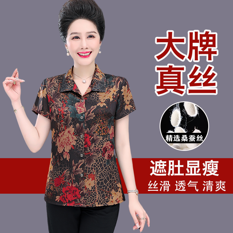 中老年人夏裝真絲襯衫女短袖洋氣大碼媽媽香云紗上衣服桑蠶絲襯衣