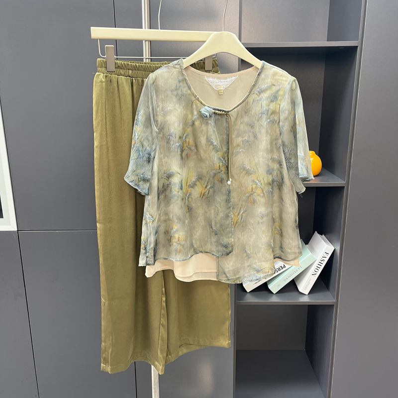 媽媽裝夏套裝短袖中老年女新中式雪紡上衣寬松端莊大氣兩件套衣服