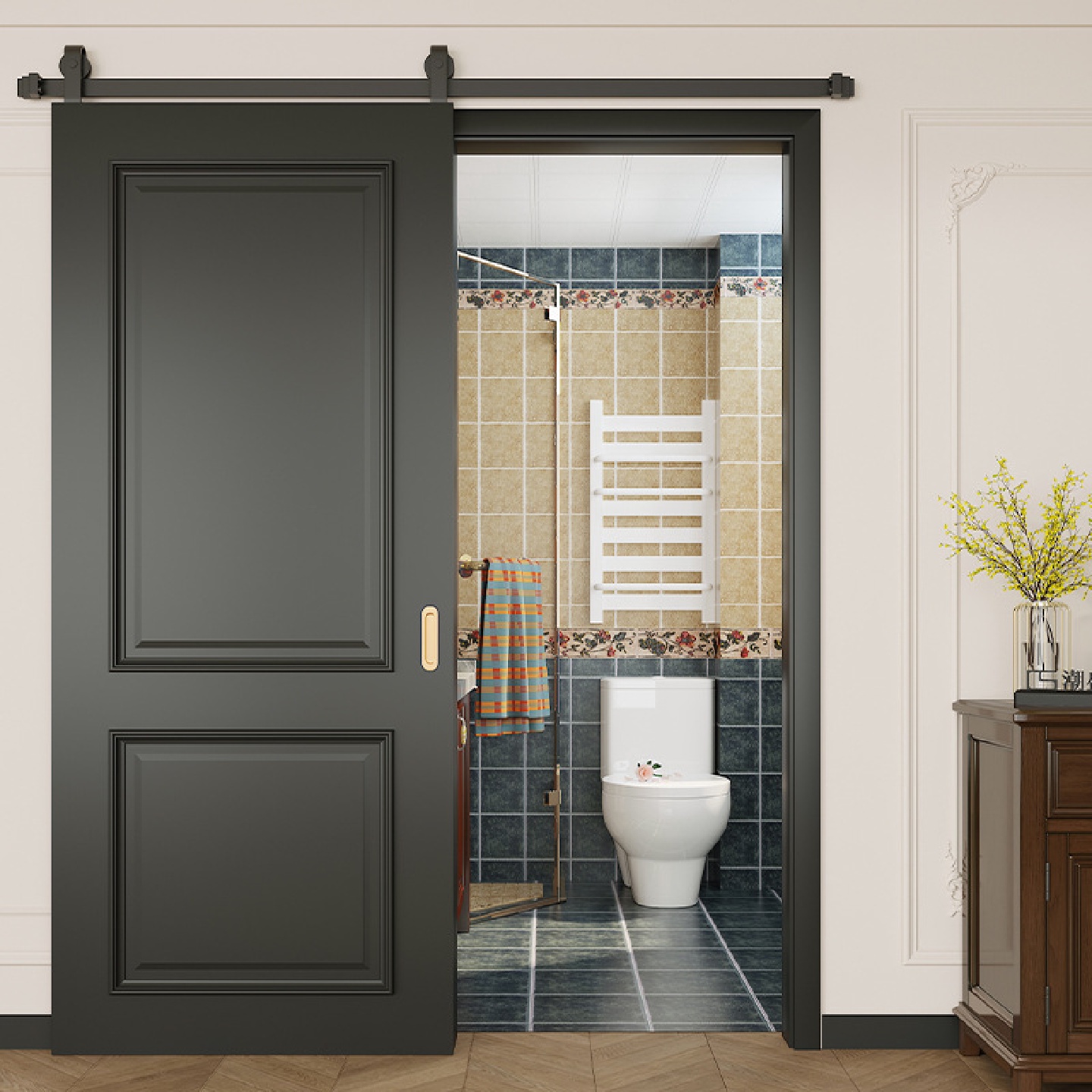 潮盛定制黑色復古實木門輕法式臥室房間推拉門吊軌谷倉門全套移門