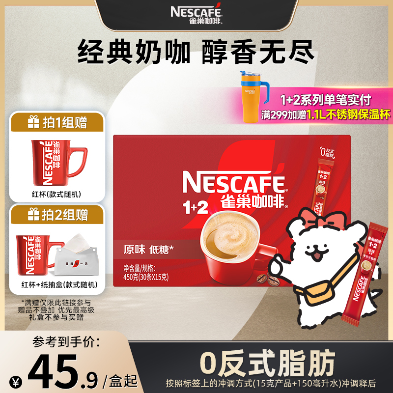 雀巢咖啡1+2原味三合一速溶咖啡粉低糖提神咖啡粉雀巢100條裝官方