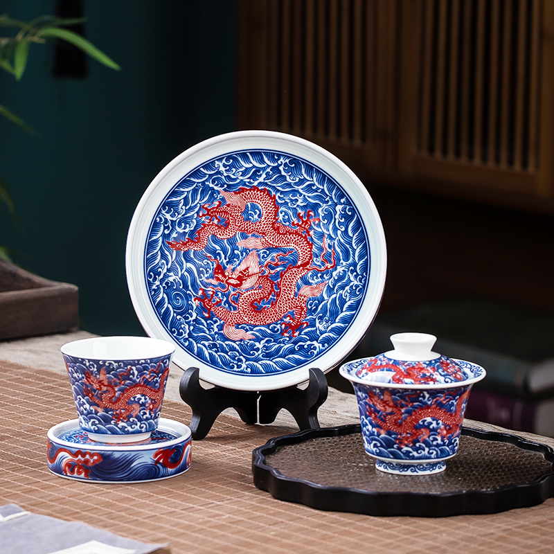 圣山景德鎮柴窯青花龍騰蓋碗陶瓷手繪蓋碗茶杯套組中式茶具泡茶碗
