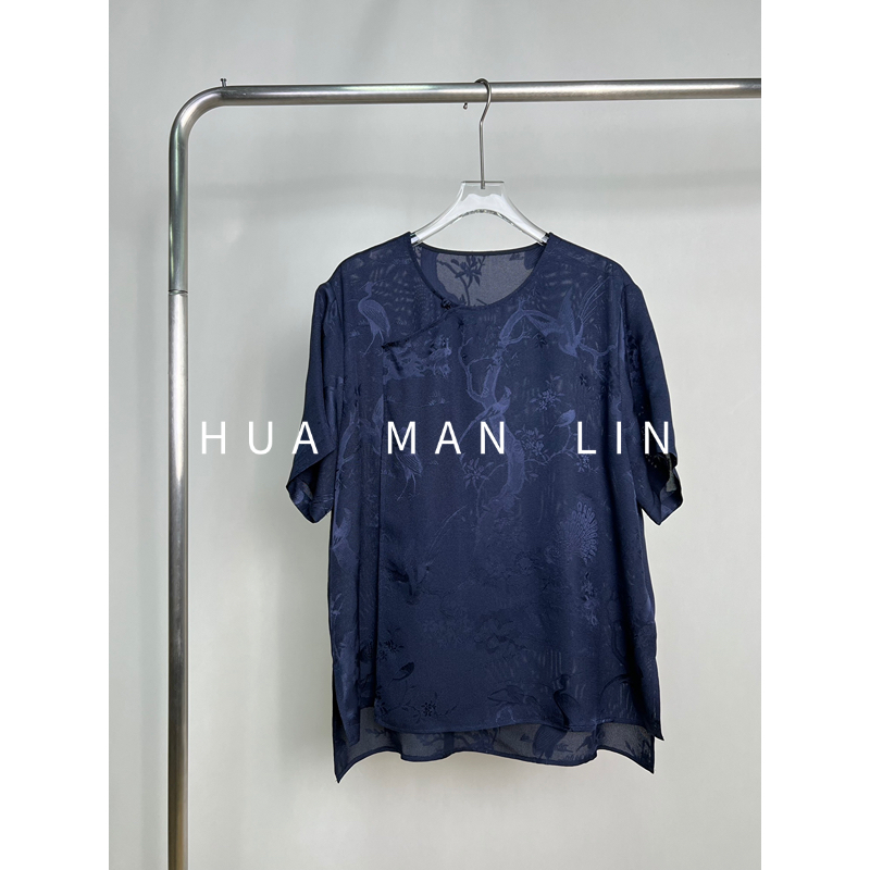 【花滿林】圓領斜門襟提花花羅真絲桑蠶絲短袖上衣245550