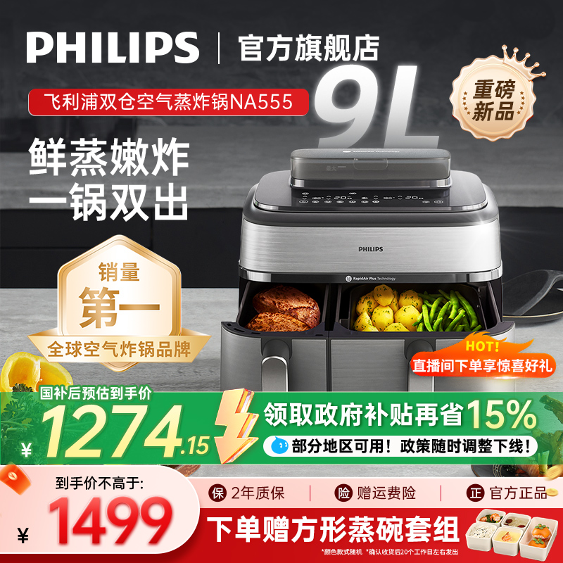 飛利浦空氣炸鍋烹飪機新款家用NA555雙倉蒸炸兩用9L大容量電炸鍋