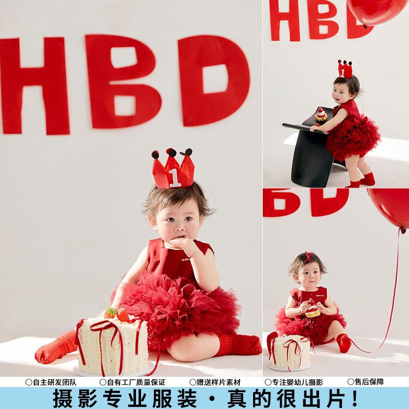 兒童攝影服裝紅色公主裙女孩生日主題影樓拍照蛋糕道具寶寶周歲照