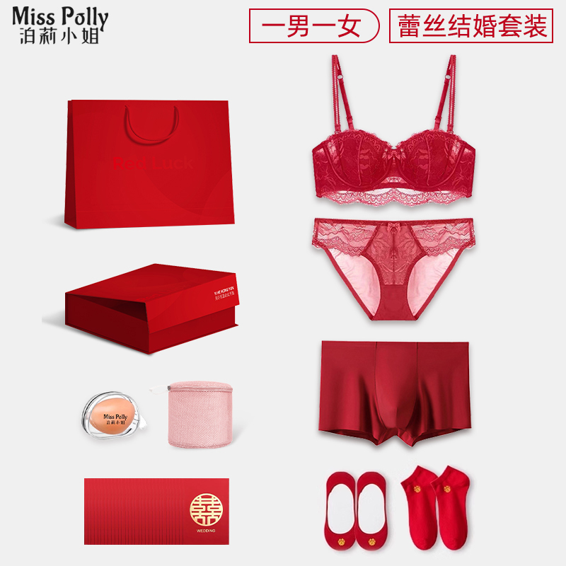 結婚內衣內褲新娘新郎套裝紅色蕾絲情侶一對襪子陪嫁妝送新人新婚