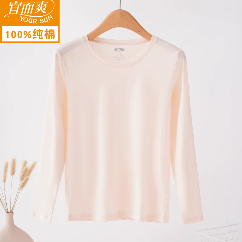 宜而爽女士超薄純棉圓領長袖秋衣中老年寬松單件上衣內穿精梳棉衫