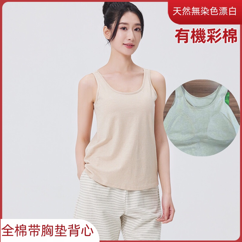 有機彩棉帶胸墊背心女士全棉夏免穿內衣運動衫固定胸墊家居服上衣