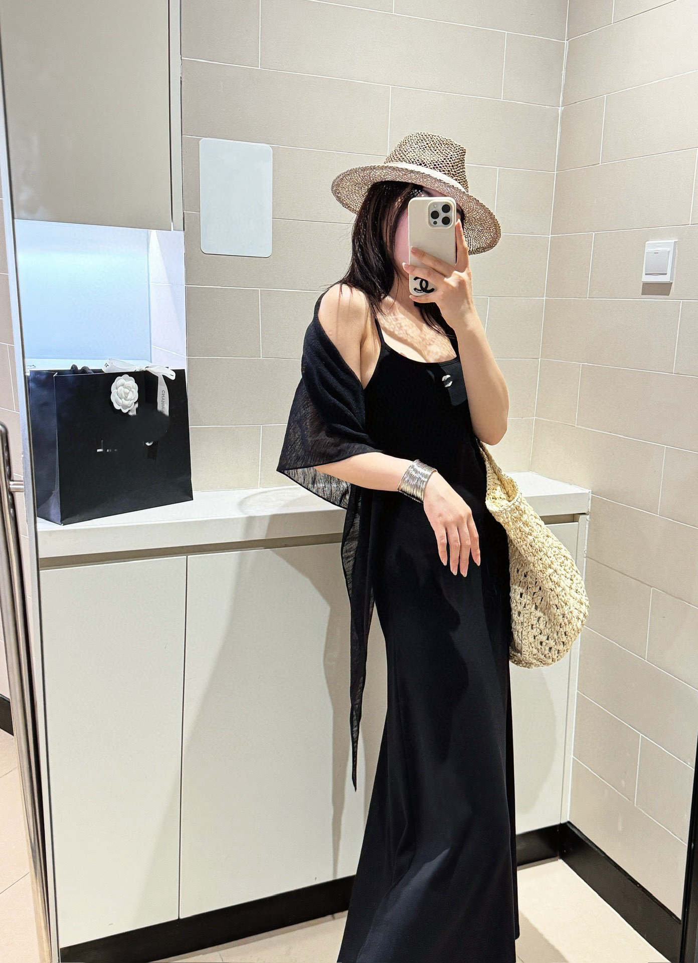 小香香吊帶裙帶胸墊黑色吊帶長裙25夏季刺繡字母吊帶背心長裙披肩
