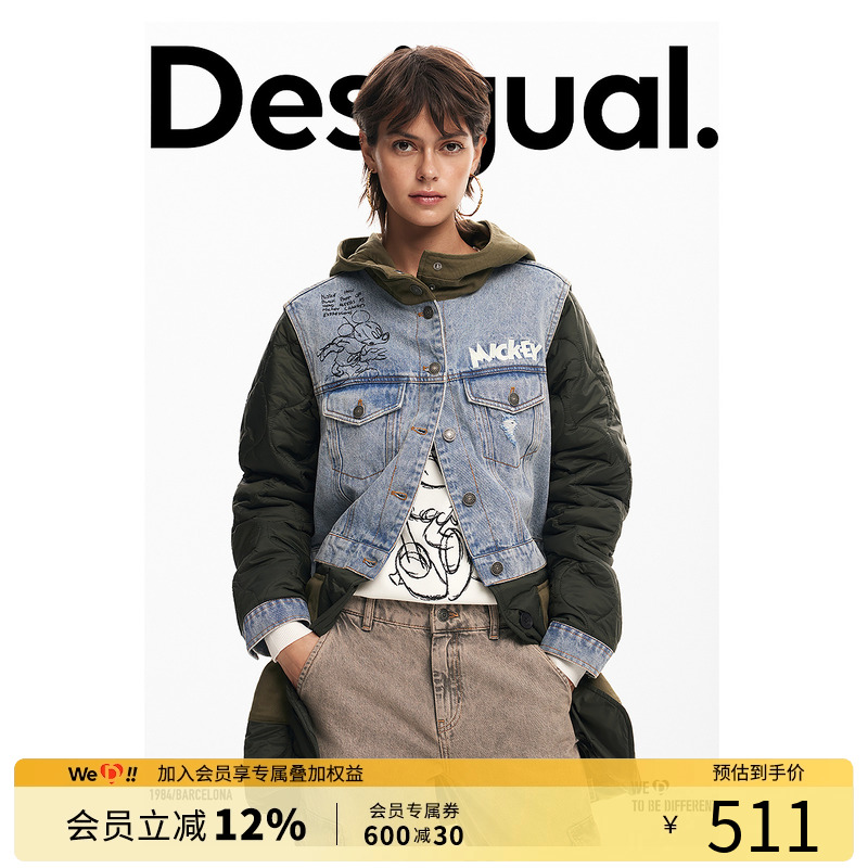 Desigual【DISNEY聯名】水洗牛仔拼接夾棉連帽女士棉服