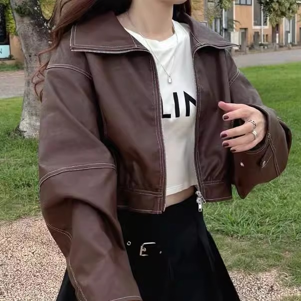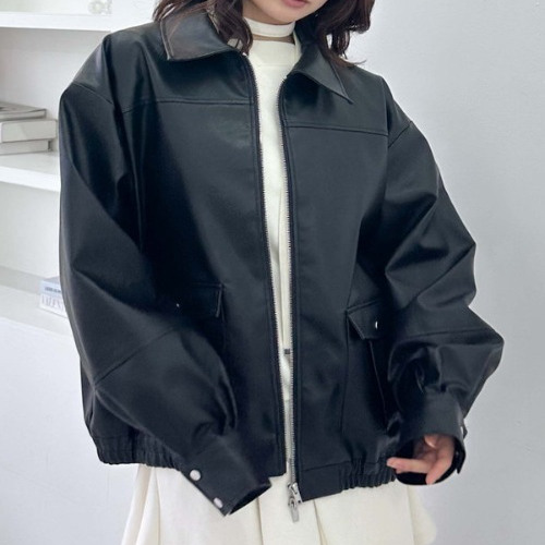 P06017日單春季新款客供GL拉鏈寬松顯瘦女純色休閑短款PU皮衣外套