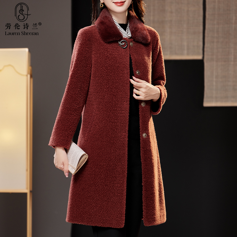 水貂毛領羊剪絨外套女中長款2024秋冬新款高級感氣質媽媽紅色大衣