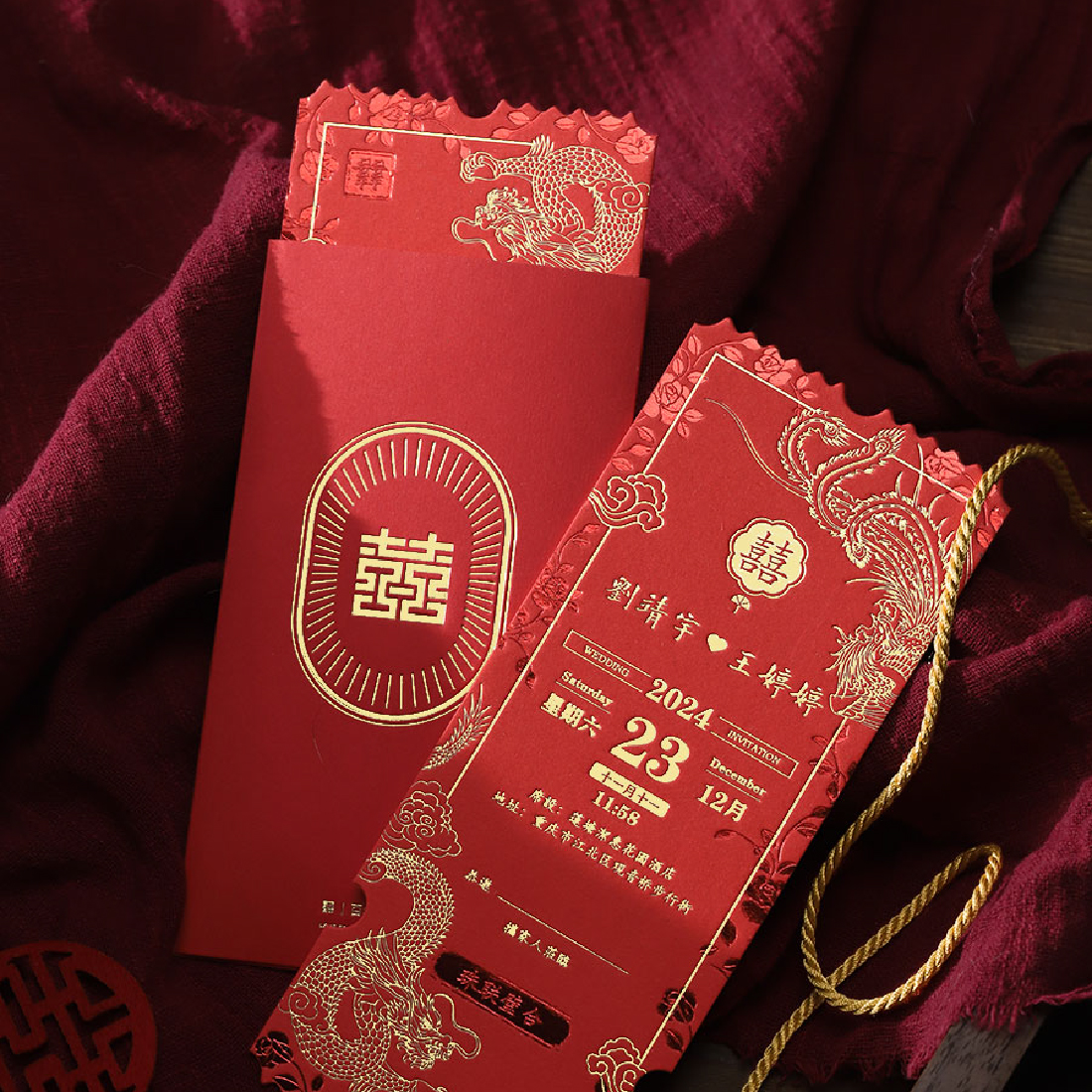 原創中國風創意票根燙金請帖新中式婚禮喜帖定制結婚請柬邀請函