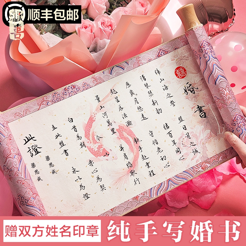 純手寫婚書訂婚書卷軸中國風送日子中式結婚禮物粉色高級感定制