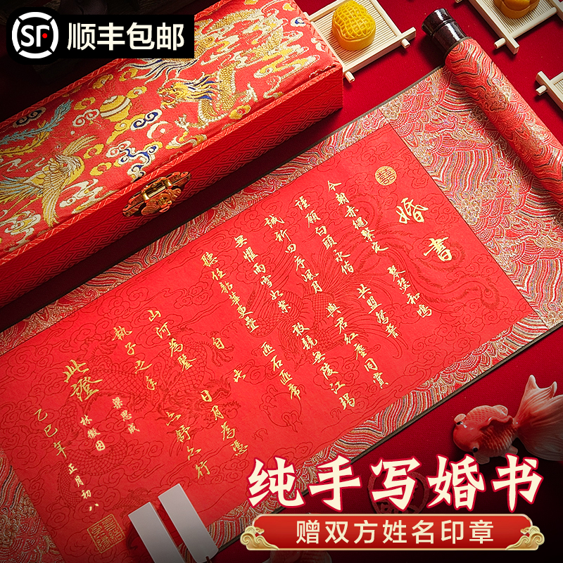 純手寫婚書訂婚書卷軸中式結婚禮物送日子書下聘結婚禮物龍鳳篆書