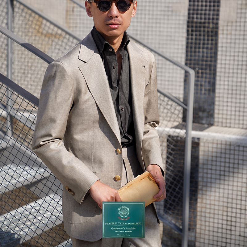 CM那不勒斯皇后 Loro香檳色魚骨紋Mare系列絲麻毛男士西裝套裝
